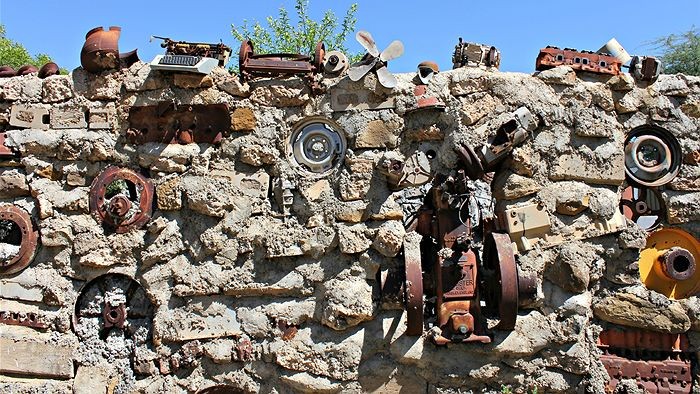 When his collection became larger than he could manage, Grotjahn decided that, rather than donating it to a museum, he would create a monument of his own. Thus, Arno’s Wall was born. Over a thirty year period, Grotjahn collected, curated, and built his seventy metre long wall. The concrete and rock structure is embedded with almost every household item imageable, as well as technology including car engines, typewriters, and an entire motorbike. In Grotjahn’s own words, “There’s everything in there: life, death, the start of the end of the world - the way I see it…” the wall contains “The entire history of Winton.”