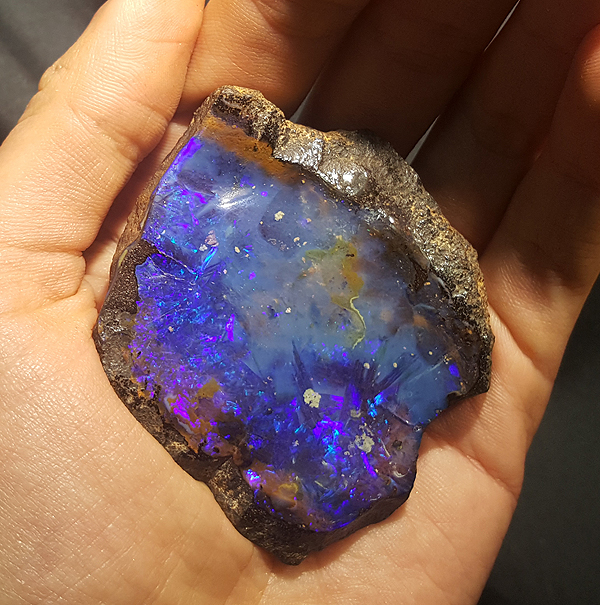 Clean Faced Boulder Opal SpecimenWhen we cut the Queensland boulder opal, we leave it naturally attached to its host ironstone. This is one of the greatest things about boulder opal: it cannot be made synthetically. If you were to glue a seam of opal onto a slab of ironstone, the glue would eventually bubble and separate from the ironstone. When an opal is glued onto a dark backing, it is called a doublet. You can read about these "enhanced" opals here.