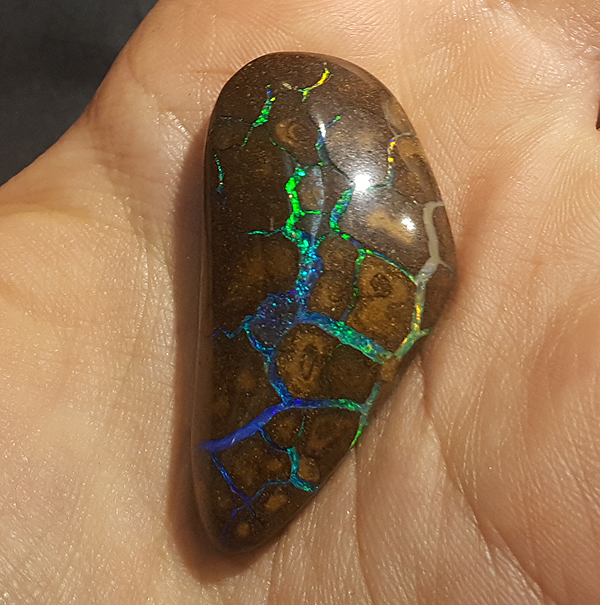 One of our favourite opal types is the boulder opal. Boulder opal is a very unique type of opal stone that is found in the most remote outback areas of Queensland. Boulder opal occurs when silica solution enters empty voids in ironstone boulders, and then, over thousands of years, forms itself into the play-of-colour that opal is famous for. The unique way that the solution flows and seeps through the ironstone creates patterns that you will not find in any of the other opal types. An interesting fact about boulder opal is that in the old days, it used to be called "Barcoo Opal", nicknamed after a river that flows through the outback.